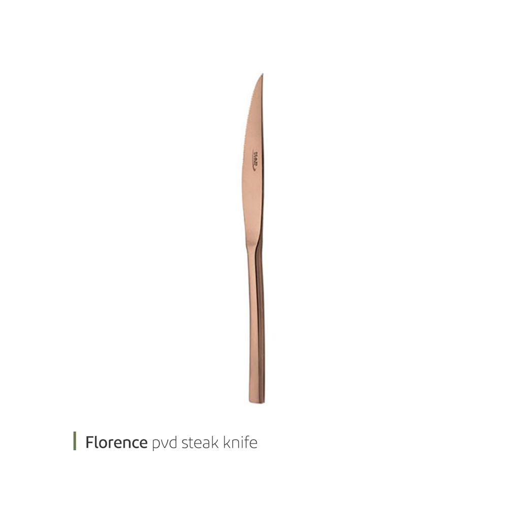 کارد استیک مدل فلورانس به دلیل نوک باریک و دنده ای بودن بیشتر برای غذاهایی سخت مانند استیک ،همبرگر و غذاهای فشرده مورد استفاده قرار می گیرد و باعث تسهیل در برش زدن وتکه تکه کردن می شود .